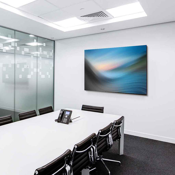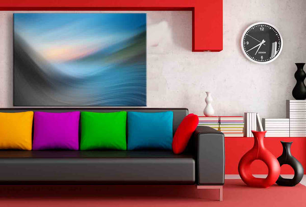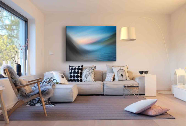 Dieses abstrakte Landschafts-Leinwandbild von AK ART verbindet die beruhigende Wirkung von Natur mit der Dynamik digitaler Kunst. Verschwommene Farbverläufe in Blau, Grau und sanftem Sonnenlicht erzeugen ein harmonisches Zusammenspiel aus Himmel, Horizont und Bewegung – als würde der Moment selbst in sanften Wellen fließen.